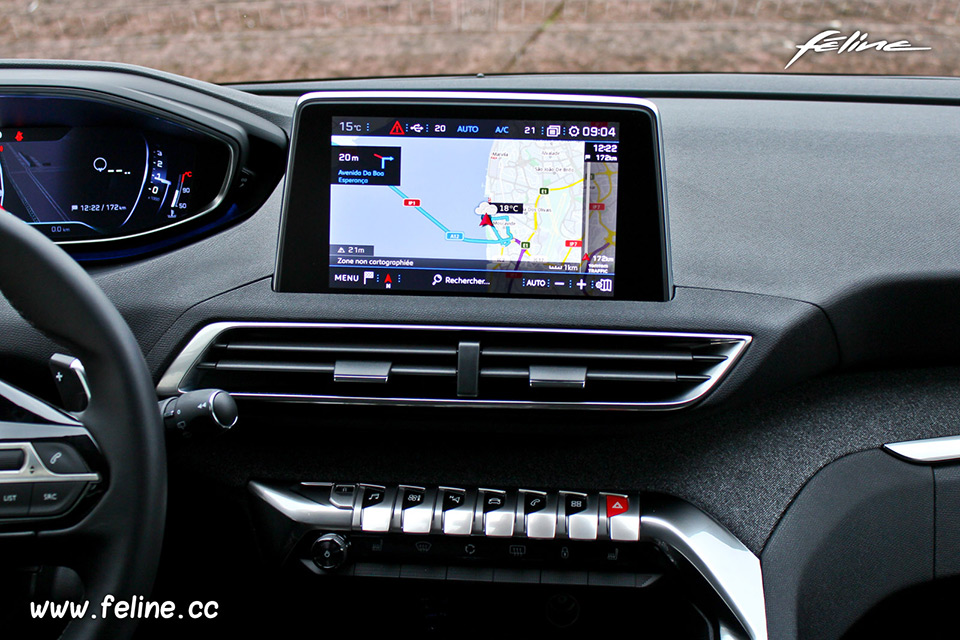 A l’intérieur, nous retrouvons également l’ambiance moderne et épurée de la nouvelle 3008 : la dernière génération du poste de conduite i-Cockpit est au rendez-vous, avec son volant compact, son écran tactile multifonctions de 8 pouces, sans oublier le combiné surélevé de 12,3 pouces, 100% numérique. Celui-ci permet, avec un design et des animations résolument futuristes, de choisir un mode d’affichage parmi cinq choix possibles, et ainsi afficher les informations sur la navigation GPS, ou encore des différentes aides à la conduite, directement sous les yeux du conducteur.