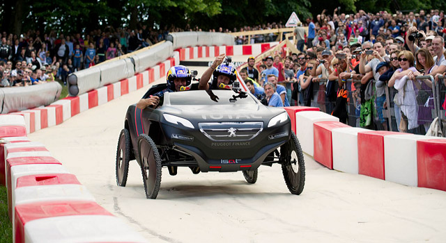 C’est d’une manière plutôt insolite que Stéphane Peterhansel a officialisé dimanche 15 juin sa participation au Dakar 2015 avec le Team Peugeot-Total. En attendant d’attaquer les pistes du rallye-raid le plus éprouvant du monde au volant de la 2008 DKR, le recordman du Dakar a pris les commandes d’un bolide Peugeot d’un autre genre afin de dévaler… les pentes du parc de Saint Cloud en compagnie de son nouvel équipier Cyril Despres !