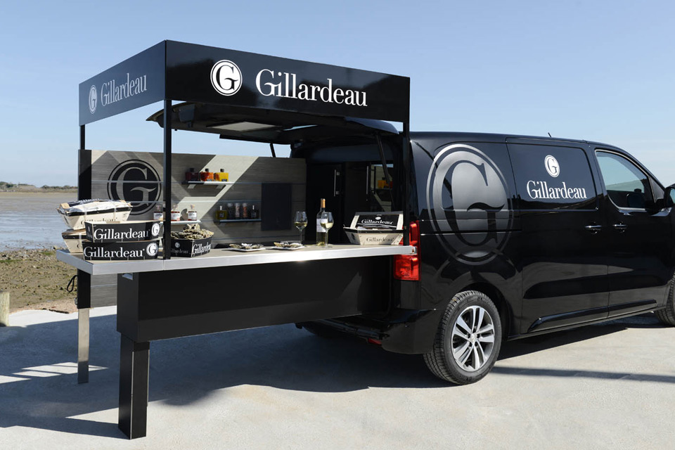 Forte de l’expérience acquise avec « Le Bistrot du Lion », l’équipe de Peugeot Design Lab a conçu pour l’entreprise Gillardeau un foodtruck faisant office de restaurant nomade, le but étant d’améliorer l’expérience avec le client. Le « bar à huîtres » a été conçu de façon à ce que les clients soient à la même hauteur que l’écailler. La conception du foodtruck lui permet d’avoir ses outils à portée de main et de ne pas se soucier des coquilles vides, qui sont évacuées via une trappe spécifique.