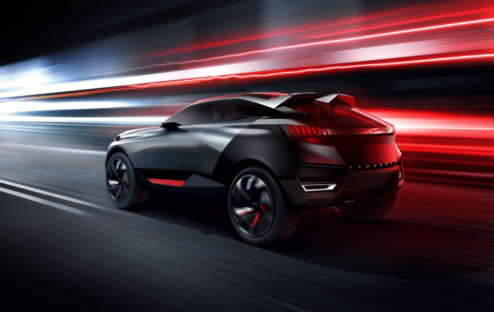Photo officielle de 3/4 arrière de la Peugeot Quartz, un concept-car crossover préfigurant une nouvelle génération de SUV haut de gamme et performant, équipé d'une motorisation hybride essence Plug-in de 500 chevaux (1.6 THP 270 + 2 machines électriques de 115 ch) et présenté au Mondial de l'Automobile de Paris en 2014 !