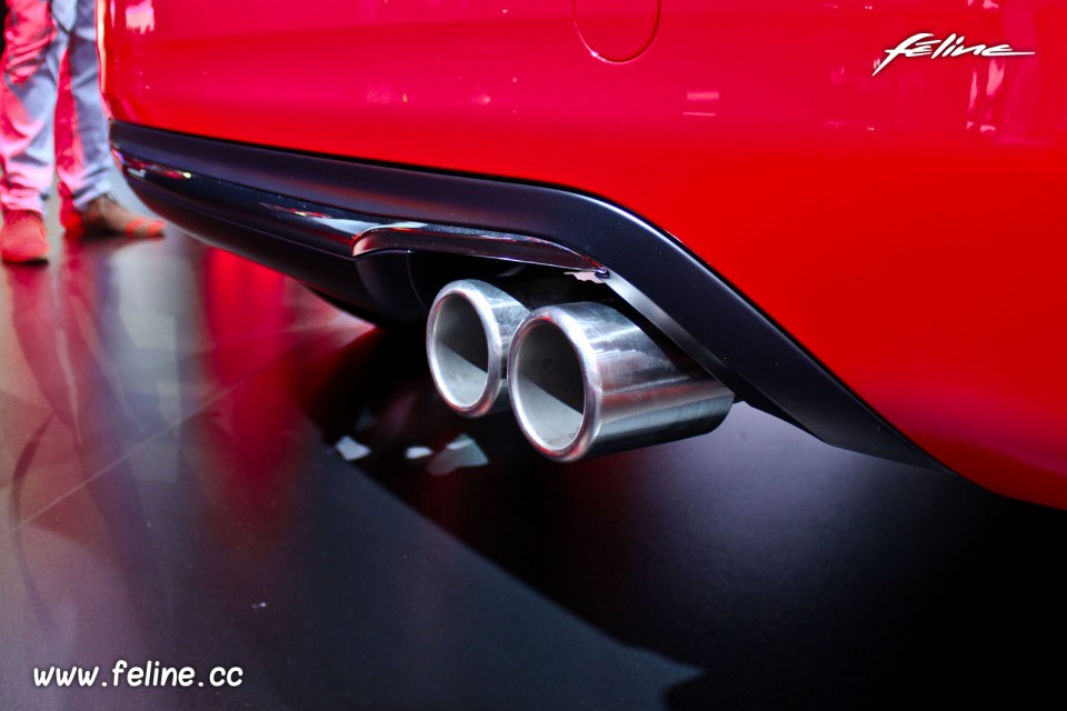 Photo de la double canule d'échappement de la Peugeot 208 GTi 30th sur le stand Peugeot au salon Mondial de l'Automobile de Paris en octobre 2014