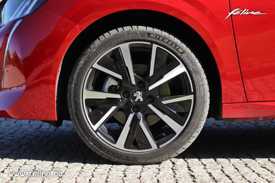 Photo d'une jante alliage Jordaan 17 pouces noir brillant de la Peugeot 208 II Allure à l'occasion des essais presse internationaux de la nouvelle Peugeot 208 II, la seconde génération de la citadine star de la marque au Lion, qui se sont tenus dans la région de Lisbonne, au Portugal (Octobre 2019)