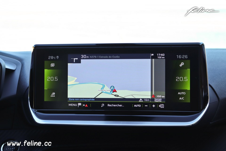 Photo de l'écran tactile 10 pouces avec navigation GPS 3D de la Peugeot 208 II Allure à l'occasion des essais presse internationaux de la nouvelle Peugeot 208 II, la seconde génération de la citadine star de la marque au Lion, qui se sont tenus dans la région de Lisbonne, au Portugal (Octobre 2019)