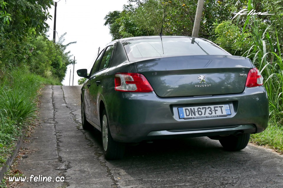 Photo de 3/4 arrière de la Peugeot 301 Sedan Active (2016), la berline compacte tri-corps équipée du moteur quatre-cylindres diesel 1,6 l HDi de 92 chevaux !