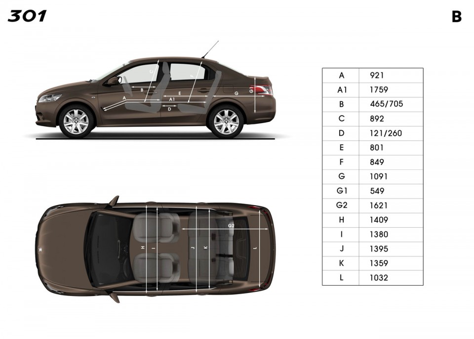 Photo officielle des principales dimensions intérieures de la Peugeot 301 I Brun Rich Oak (2012), la berline tri-corps accessible et fiable, qui séduit par son design élégant, sa silhouette de caractère et ses lignes harmonieuses conjuguant ainsi modernité et robustesse...