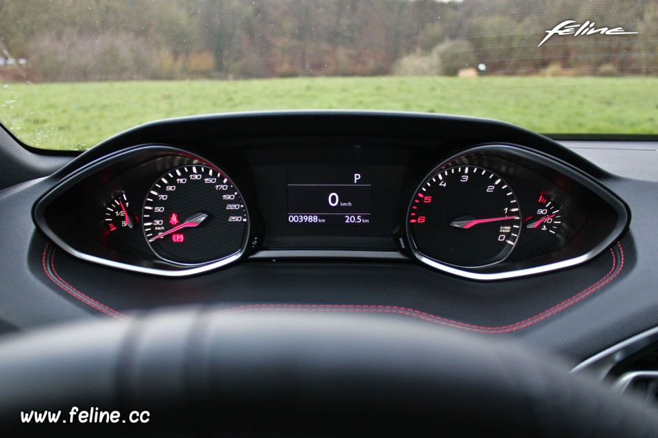 Photo du combiné de la Peugeot 308 GT Bleu Magnetic lors de notre essai de la 308 GT équipée de la motorisation quatre cylindres diesel 2.0l BlueHDi de 180 chevaux, avec boîte automatique EAT6