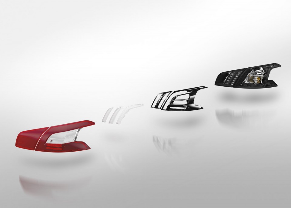 Photo officielle d'un feu arrière LED à masque sombre de la nouvelle Peugeot 308 GT restylée (2017), présentée ici dans sa version haut de gamme GT avec la peinture métallisée Bleu Magnetic