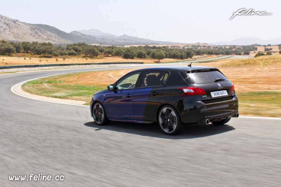 Photo de l'essai de la Peugeot 308 GTi restylée Coupe Franche Bleu Magnetic / Noir Perla Nera à l'occasion des essais presse internationaux de la nouvelle Peugeot 308 GTi by Peugeot Sport sur le circuit d'Ascari, en Espagne (Juillet 2017)