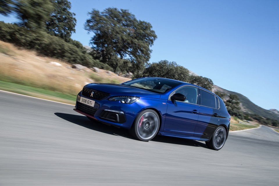 Photo officielle de 3/4 avant de la Peugeot 308 GTi restylée Coupe Franche Bleu Magnetic / Noir Perla Nera lors des essais internationaux de la Peugeot 308 GTi by Peugeot Sport restylée sur le circuit d'Ascari dans la région de Málaga, en Espagne (Juillet 2017)