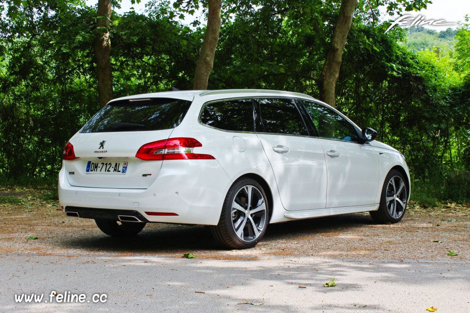 Photo de 3/4 arrière de la Peugeot 308 SW GT Blanc Nacré lors de notre essai de la nouvelle 308 SW GT équipée de la motorisation quatre cylindres essence 1.6l THP de 205 chevaux, avec boîte mécanique BVM6