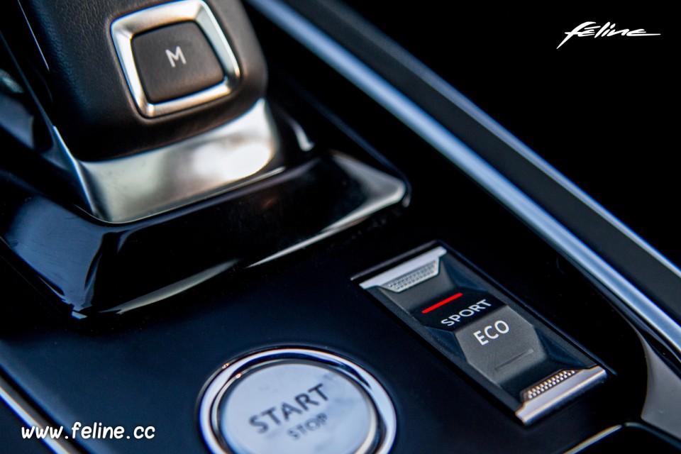 Photo du bouton Sport Eco de la Peugeot 308 SW II GT restylée Rouge Ultimate, équipée du nouveau moteur quatre cylindres essence turbo 1.6 litres PureTech (THP) de 225 chevaux, et dotée de la boîte automatique EAT8