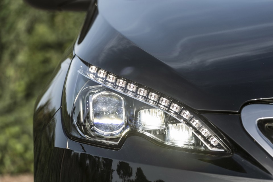 Photo officielle d'un projecteur avant Full LED de la nouvelle Peugeot 308 SW II Féline Noir Perla Nera, le nouveau break compact du Lion dynamique et racé, en Espagne