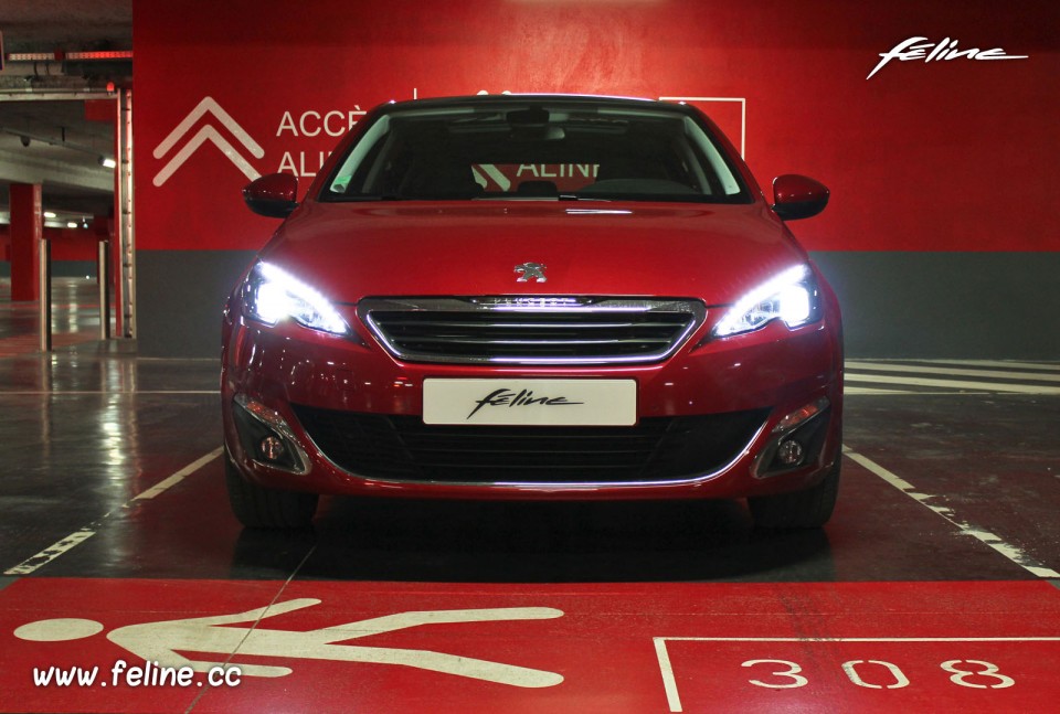 Photo de face avant parking de la nouvelle Peugeot 308 II Allure Rouge Rubi, équipée du moteur essence 1.6l THP 16V de 125 chevaux avec boîte manuelle BVM6