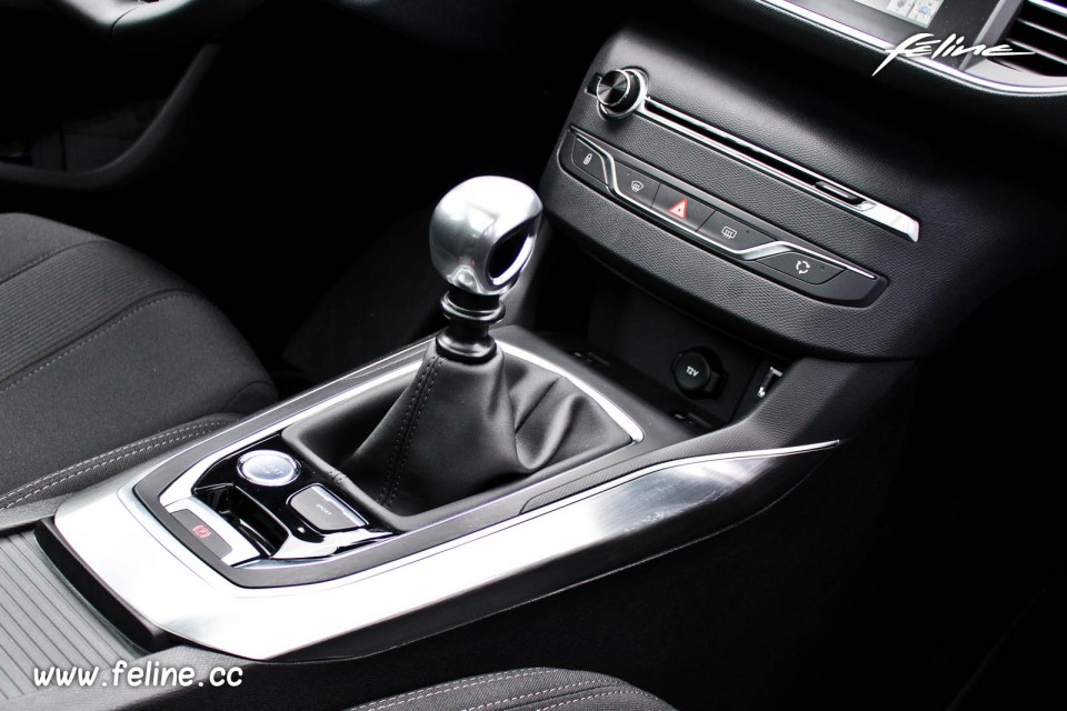 Photo de la console centrale de la nouvelle Peugeot 308 II Allure Gris Moka, équipée du moteur essence EB Turbo PureTech 1.2l e-THP 12V de 130 chevaux avec boîte manuelle BVM6 et Driver Sport Pack
