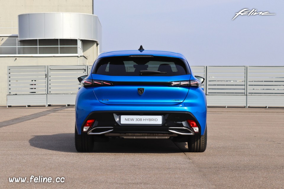 Photo de face arrière de la Peugeot 308 GT III HYbrid 225 Bleu Vertigo, la nouvelle berline compacte de Peugeot, à l'occasion de notre premier contact et shooting photo en avant-première de sa présentation et sa commercialisation prévue en septembre 2021