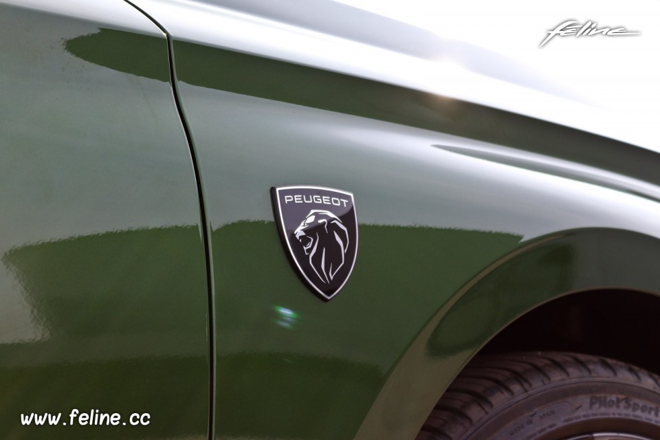 Photo du sigle sur l'aile avant de la Peugeot 308 GT III Vert Olivine HYbrid 225, la nouvelle berline compacte de Peugeot, à l'occasion de notre premier contact et shooting photo en avant-première de sa présentation et sa commercialisation prévue en septembre 2021