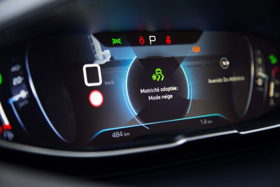 Photo officielle de l'affichage du Grip Control sur le combiné virtuel i-Cockpit de la Peugeot 5008 II GT lors des essais presse internationaux du nouveau SUV Peugeot 5008 II de la marque au Lion dans la région de Lisbonne, au Portugal (Février 2017)