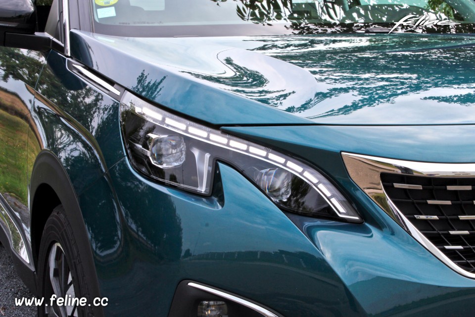 Photo d'un phare avant Full LED de la Peugeot 5008 Allure 2017 Emerald Crystal, lors de notre essai du nouveau SUV Peugeot 5008 II équipé du moteur quatre cylindres diesel 1,6 litre BlueHDi de 120 chevaux couplé à la boîte automatique EAT6 à six rapports.