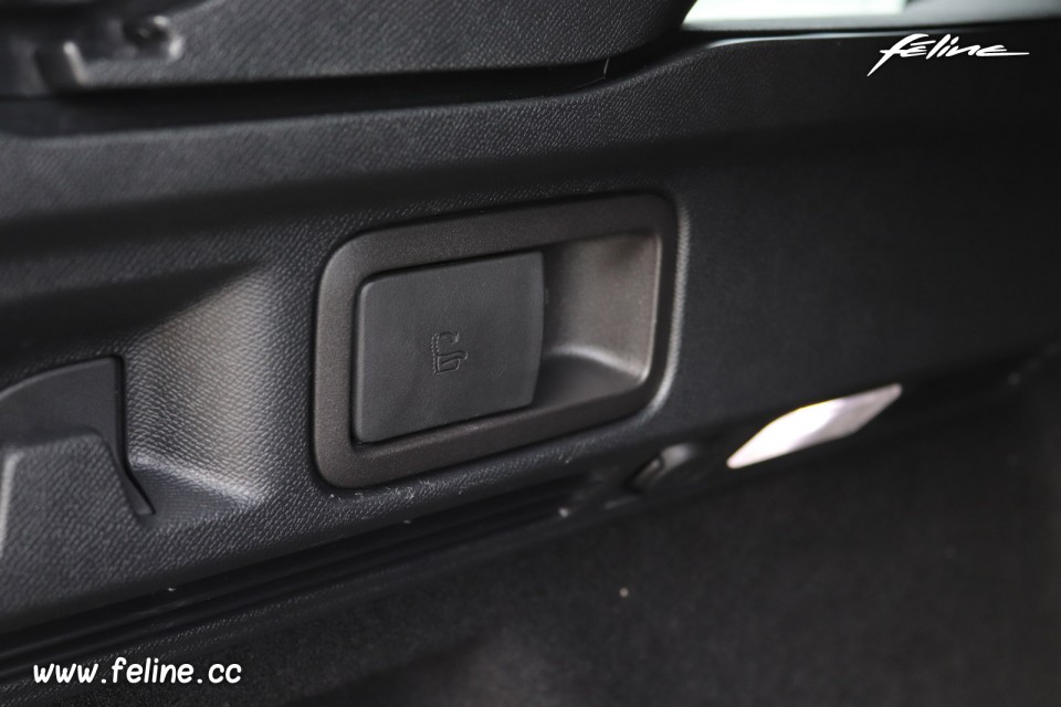 Photo d'une manette de commande Magic Flat de la banquette arrière de la Peugeot 508 SW II à l'occasion des essais presse internationaux de la nouvelle Peugeot 508 SW II, le nouveau break radical de la marque au Lion, qui se sont tenus dans la région de Lisbonne, au Portugal (Novembre 2018)