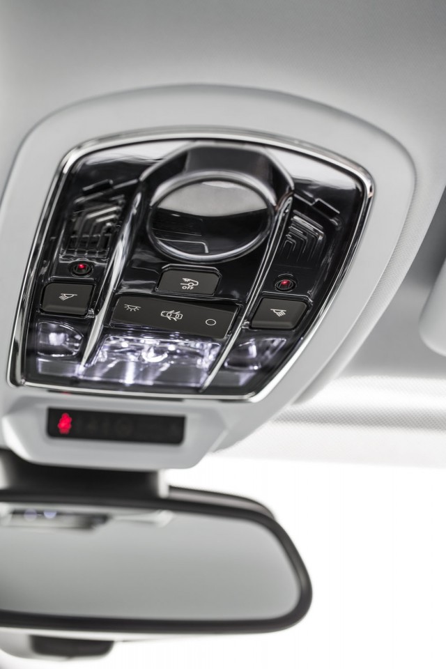 Photo officielle du plafonnier avec spots de lecture de la Peugeot 508 restylée (phase 2 - 2014), la grande berline routière revisitée, avec une nouvelle face avant plus volontaire et statutaire, qui accentue les valeurs d'élégance, de pureté et de sobriété de la 508...
