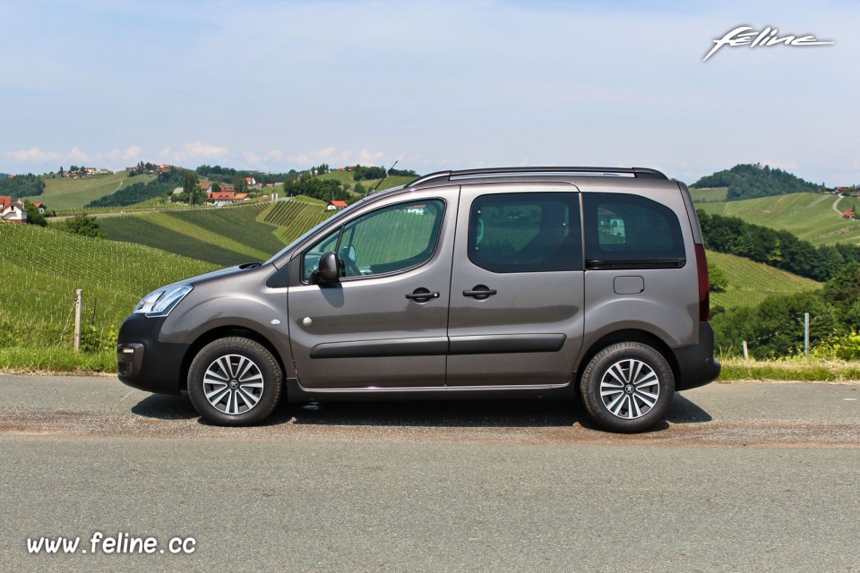 Photo de profil du Peugeot Partner II Tepee Outdoor restylé Gris Moka, à l'occasion des essais internationaux du nouveau Peugeot Partner restylé en Autriche (Mai 2015)