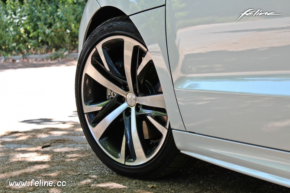 Photo d'une jante aluminium 19 pouces Technical Grey de la Peugeot RCZ GT Line Blanc Nacré lors de notre essai de la nouvelle RCZ GT Line équipée de la motorisation quatre cylindres diesel 2.0l HDi de 160 chevaux, avec boîte mécanique BVM6