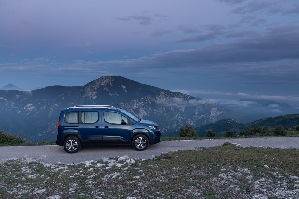 Photo officielle de profil du Peugeot Rifter Allure Deep Blue lors des essais presse internationaux du nouveau Peugeot Rifter de la marque au Lion dans la région de Nice, entre la France et Monaco (Juin 2018)